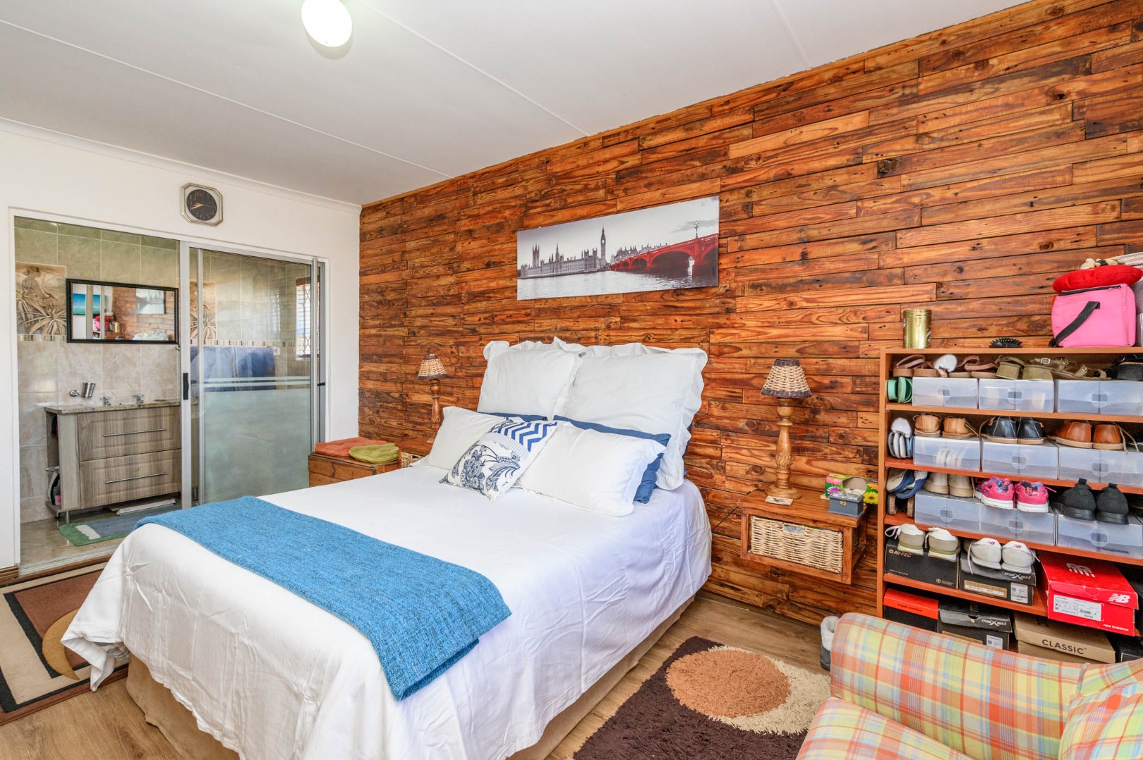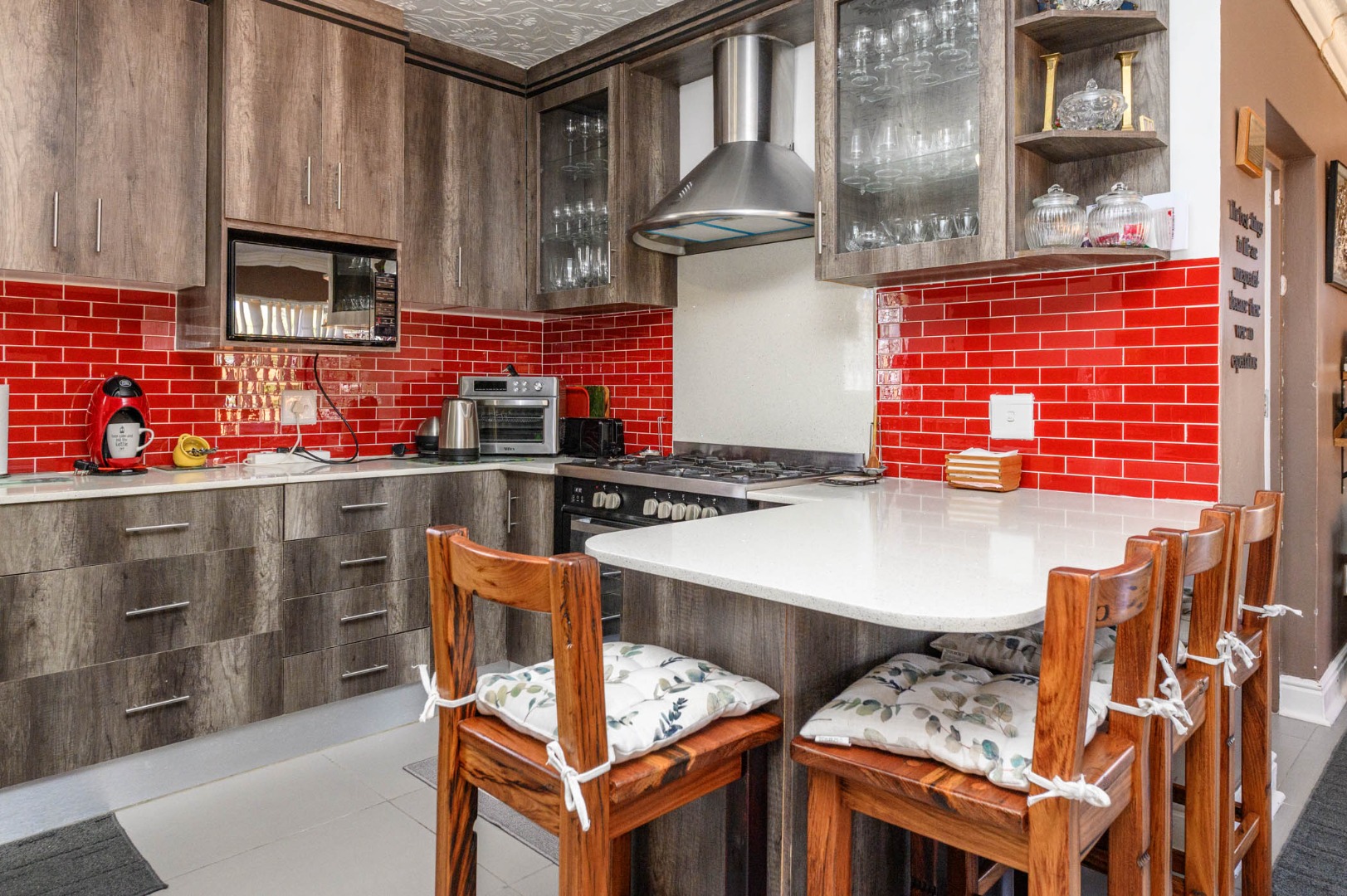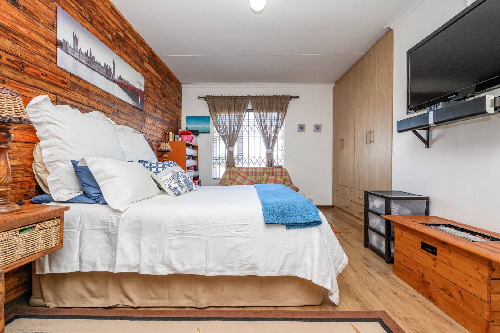 The stylish and generously sized kitchen is fitted with modern decorative wall tiles and ample storage space. The large gas stove and upright fridge-freezer will remain, adding further value for the new owner. All ceilings throughout the home are modern and decorative, enhancing the sophisticated feel of the interiors. Two spacious guest bedrooms are fitted with built-in cupboards, while the large main bedroom includes an attractive feature wall, en-suite bathroom, and generous cupboard space. Blinds enhance most windows, and the home is finished with a tasteful combination of tile and laminate flooring. The property also features a solar geyser and exterior lighting all around the home for safety and security, managed by a day-night switch. An alarm system provides added peace of mind, while a small outbuilding in the courtyard offers extra storage.