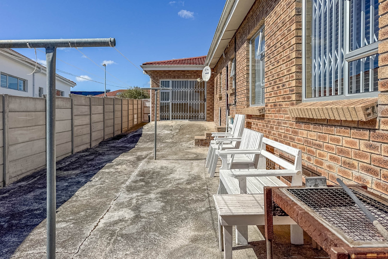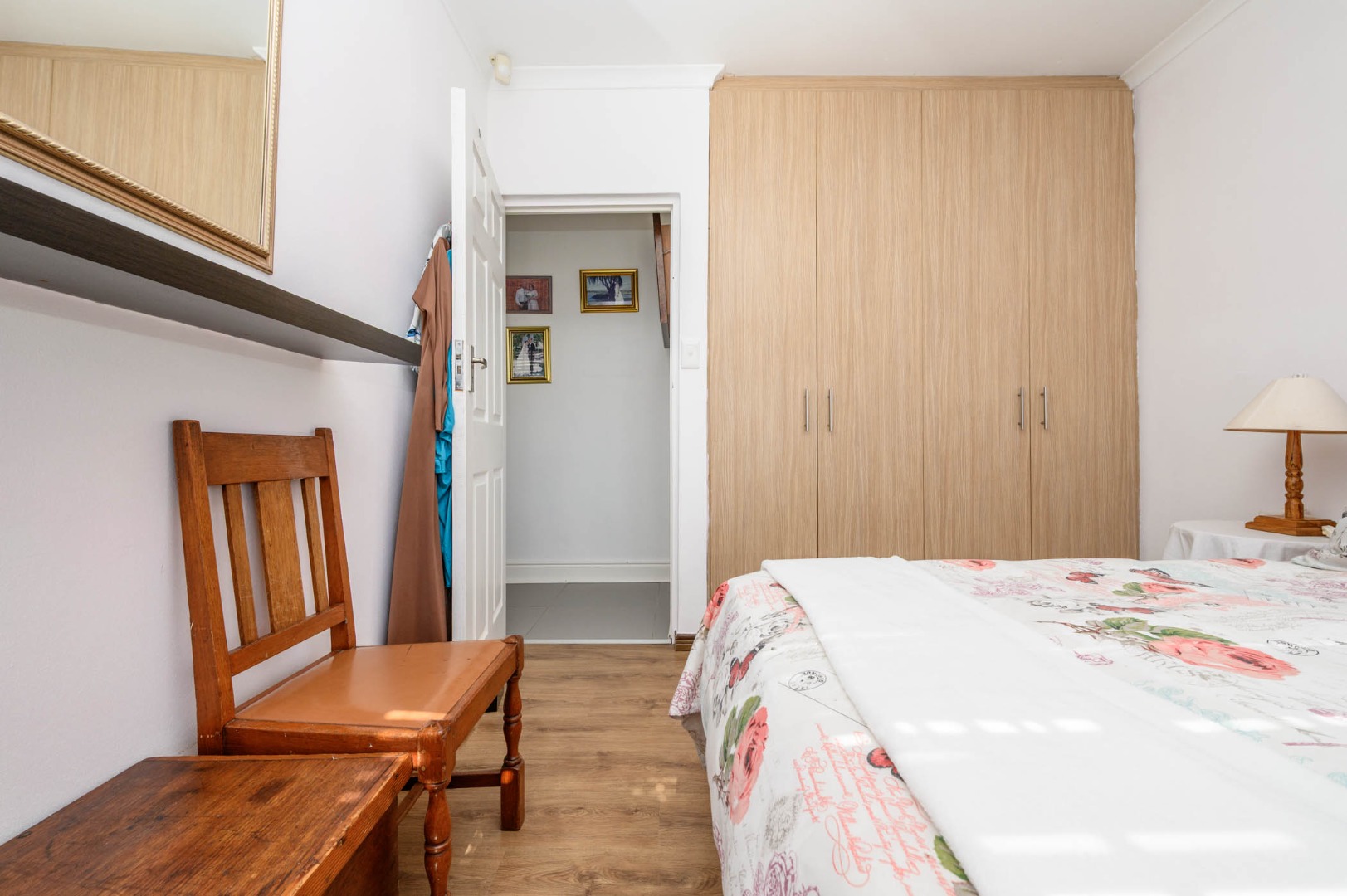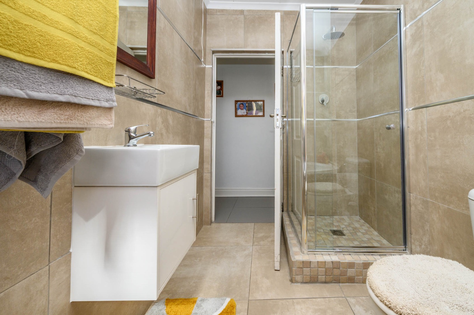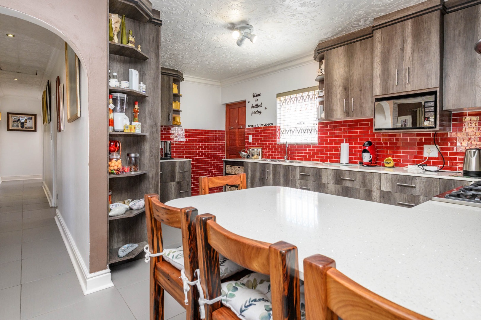 The stylish and generously sized kitchen is fitted with modern decorative wall tiles and ample storage space. The large gas stove and upright fridge-freezer will remain, adding further value for the new owner. All ceilings throughout the home are modern and decorative, enhancing the sophisticated feel of the interiors. Two spacious guest bedrooms are fitted with built-in cupboards, while the large main bedroom includes an attractive feature wall, en-suite bathroom, and generous cupboard space. Blinds enhance most windows, and the home is finished with a tasteful combination of tile and laminate flooring. The property also features a solar geyser and exterior lighting all around the home for safety and security, managed by a day-night switch. An alarm system provides added peace of mind, while a small outbuilding in the courtyard offers extra storage.