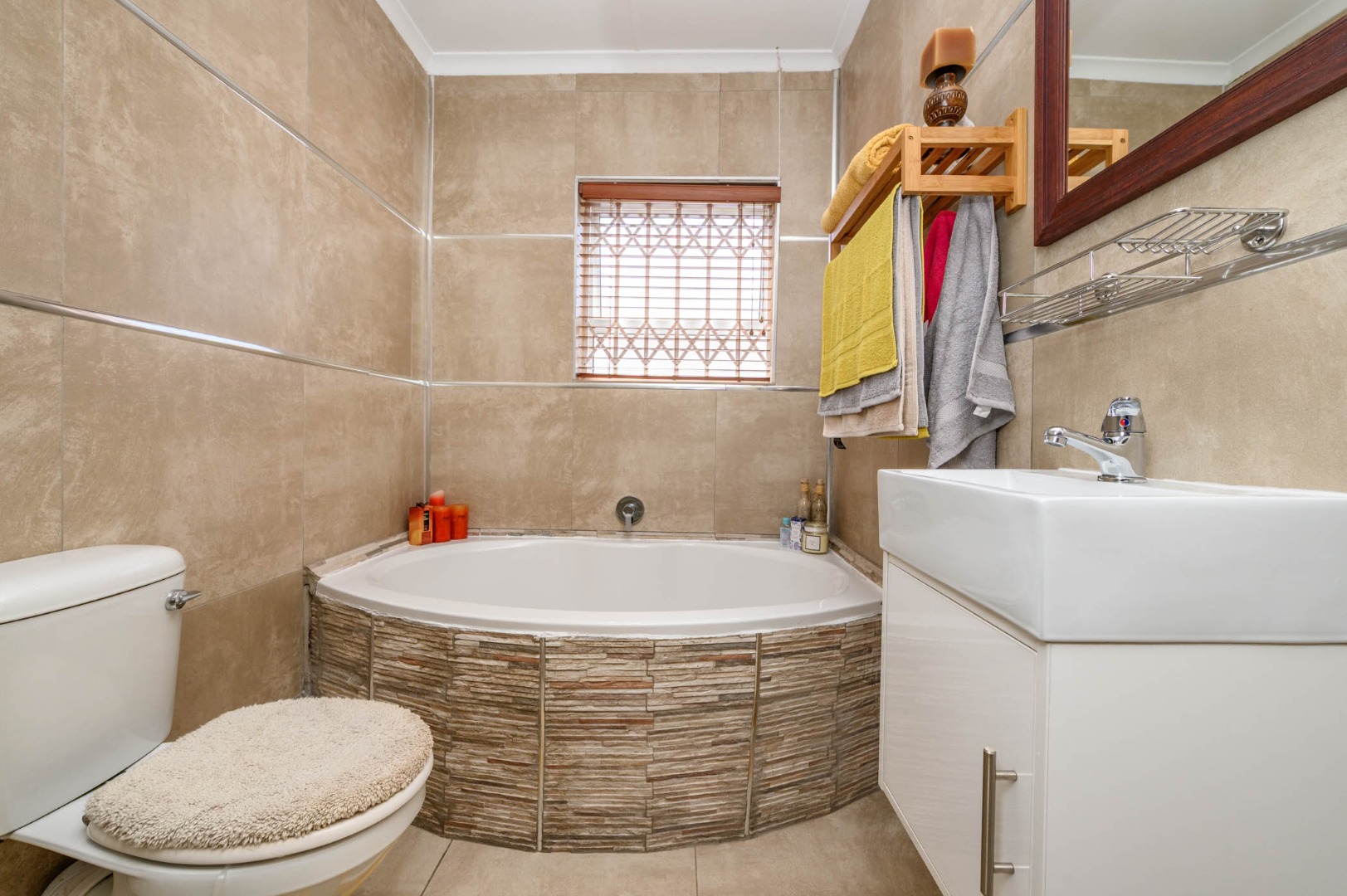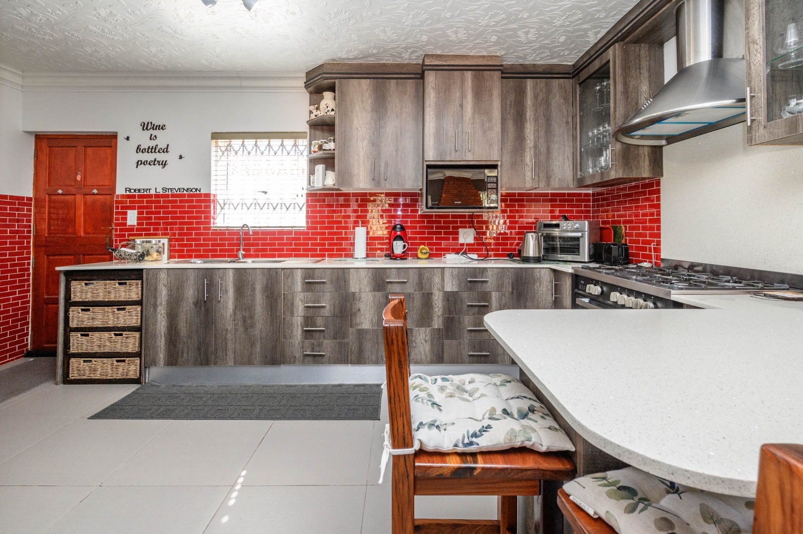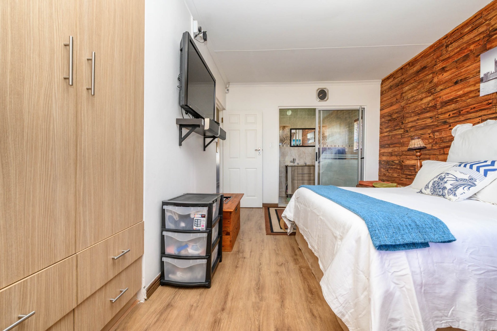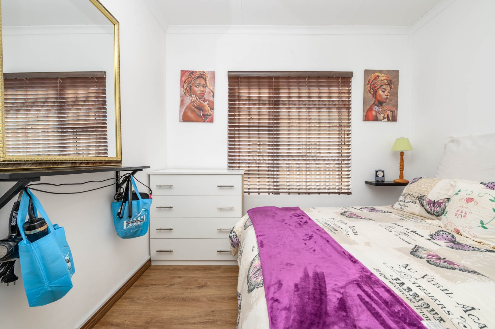 The stylish and generously sized kitchen is fitted with modern decorative wall tiles and ample storage space. The large gas stove and upright fridge-freezer will remain, adding further value for the new owner. All ceilings throughout the home are modern and decorative, enhancing the sophisticated feel of the interiors. Two spacious guest bedrooms are fitted with built-in cupboards, while the large main bedroom includes an attractive feature wall, en-suite bathroom, and generous cupboard space. Blinds enhance most windows, and the home is finished with a tasteful combination of tile and laminate flooring. The property also features a solar geyser and exterior lighting all around the home for safety and security, managed by a day-night switch. An alarm system provides added peace of mind, while a small outbuilding in the courtyard offers extra storage.