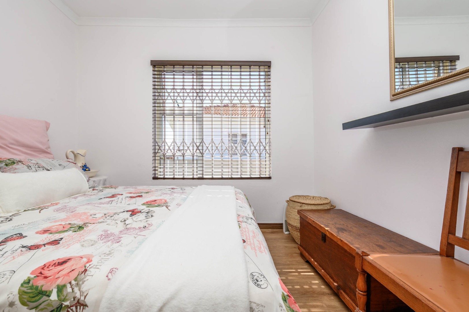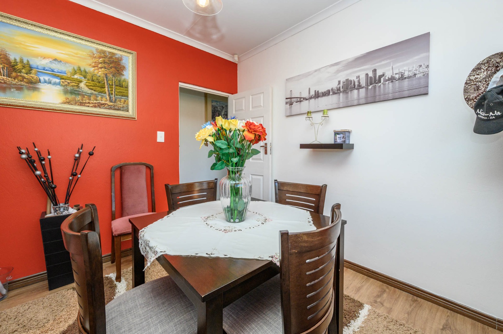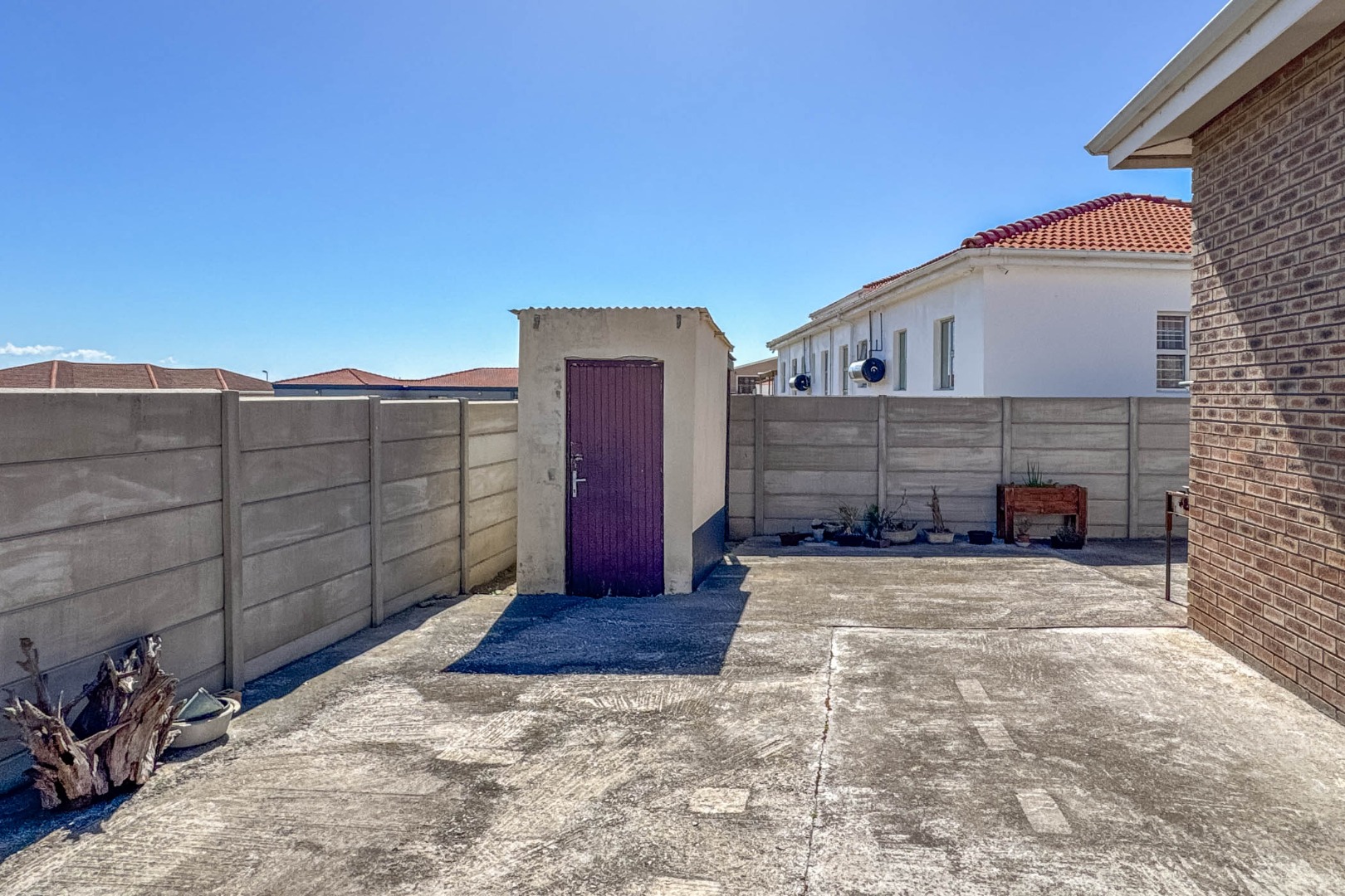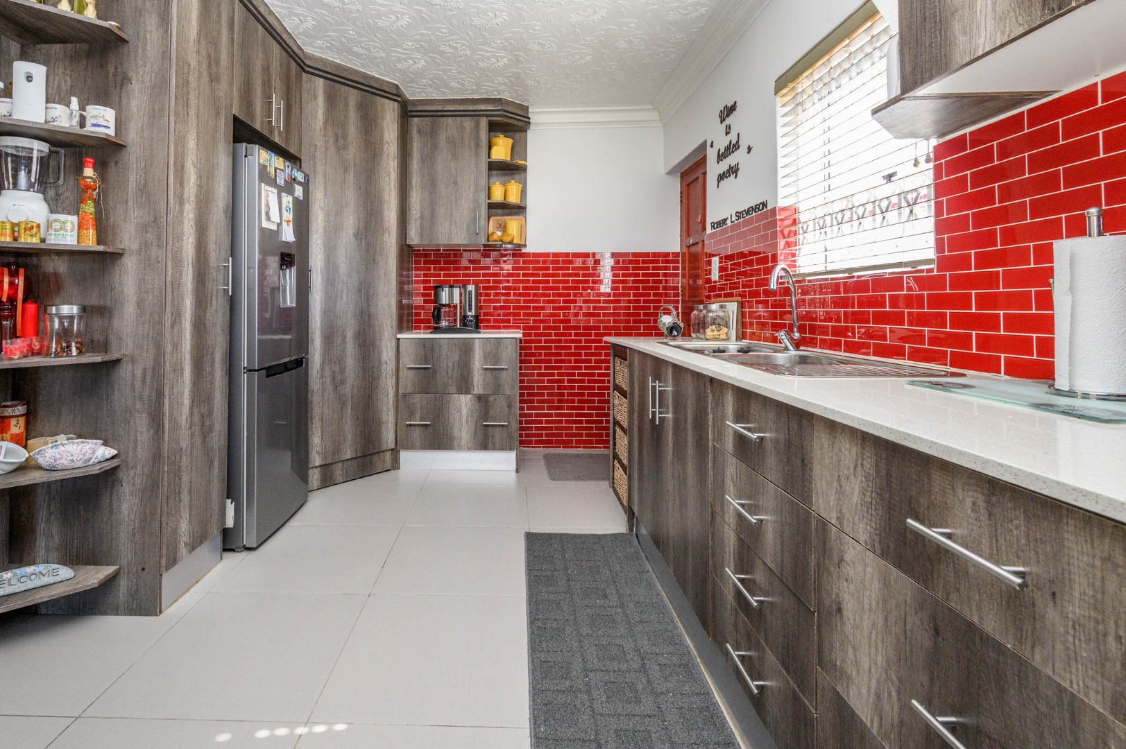 The stylish and generously sized kitchen is fitted with modern decorative wall tiles and ample storage space. The large gas stove and upright fridge-freezer will remain, adding further value for the new owner. All ceilings throughout the home are modern and decorative, enhancing the sophisticated feel of the interiors. Two spacious guest bedrooms are fitted with built-in cupboards, while the large main bedroom includes an attractive feature wall, en-suite bathroom, and generous cupboard space. Blinds enhance most windows, and the home is finished with a tasteful combination of tile and laminate flooring. The property also features a solar geyser and exterior lighting all around the home for safety and security, managed by a day-night switch. An alarm system provides added peace of mind, while a small outbuilding in the courtyard offers extra storage.
