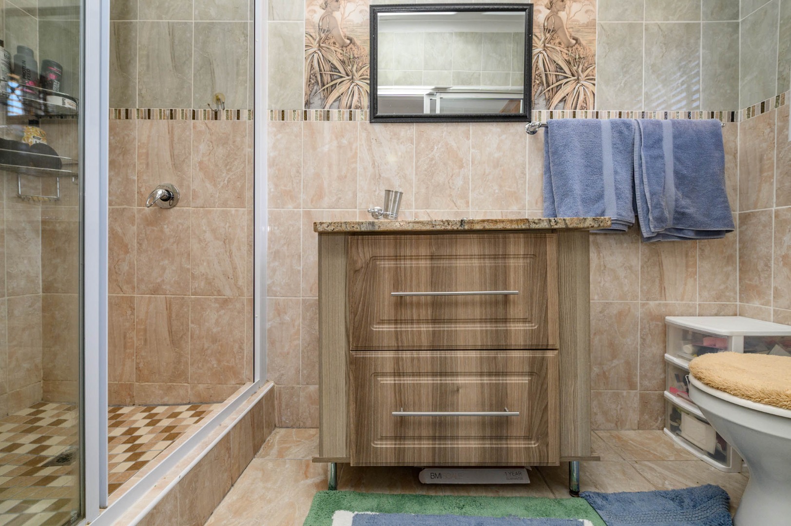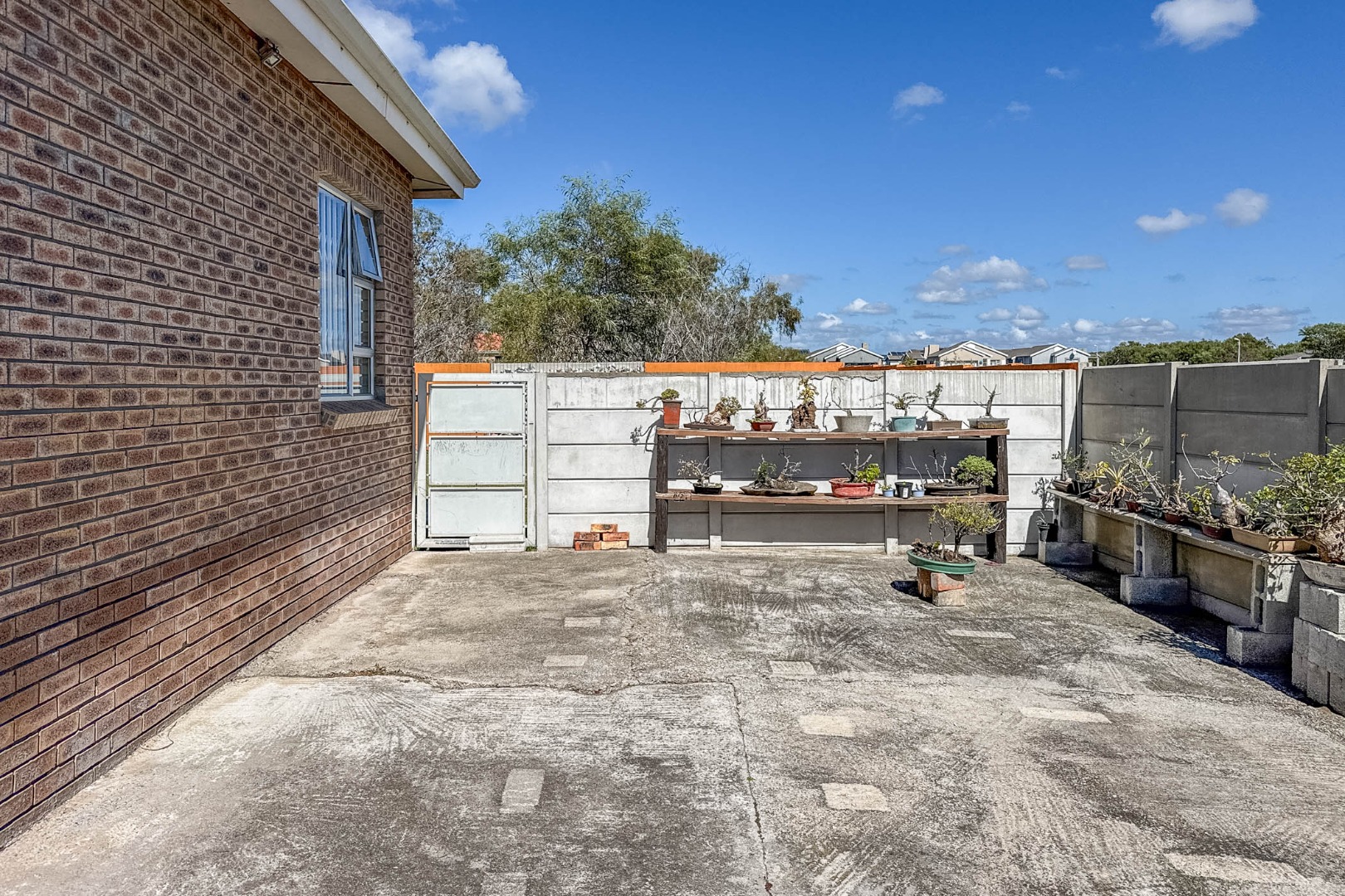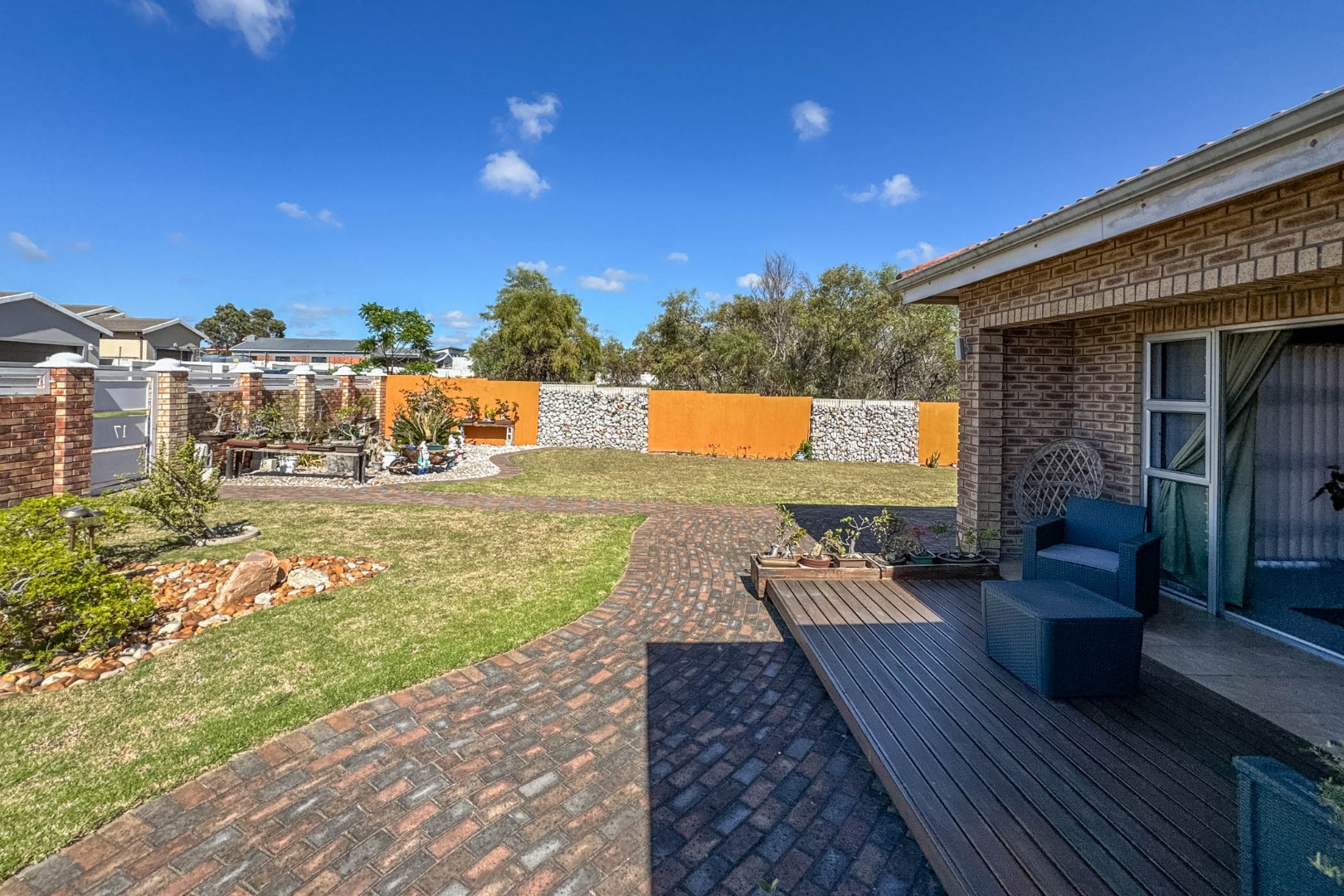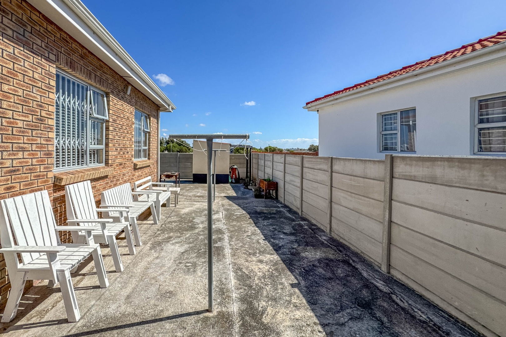 The stylish and generously sized kitchen is fitted with modern decorative wall tiles and ample storage space. The large gas stove and upright fridge-freezer will remain, adding further value for the new owner. All ceilings throughout the home are modern and decorative, enhancing the sophisticated feel of the interiors. Two spacious guest bedrooms are fitted with built-in cupboards, while the large main bedroom includes an attractive feature wall, en-suite bathroom, and generous cupboard space. Blinds enhance most windows, and the home is finished with a tasteful combination of tile and laminate flooring. The property also features a solar geyser and exterior lighting all around the home for safety and security, managed by a day-night switch. An alarm system provides added peace of mind, while a small outbuilding in the courtyard offers extra storage.