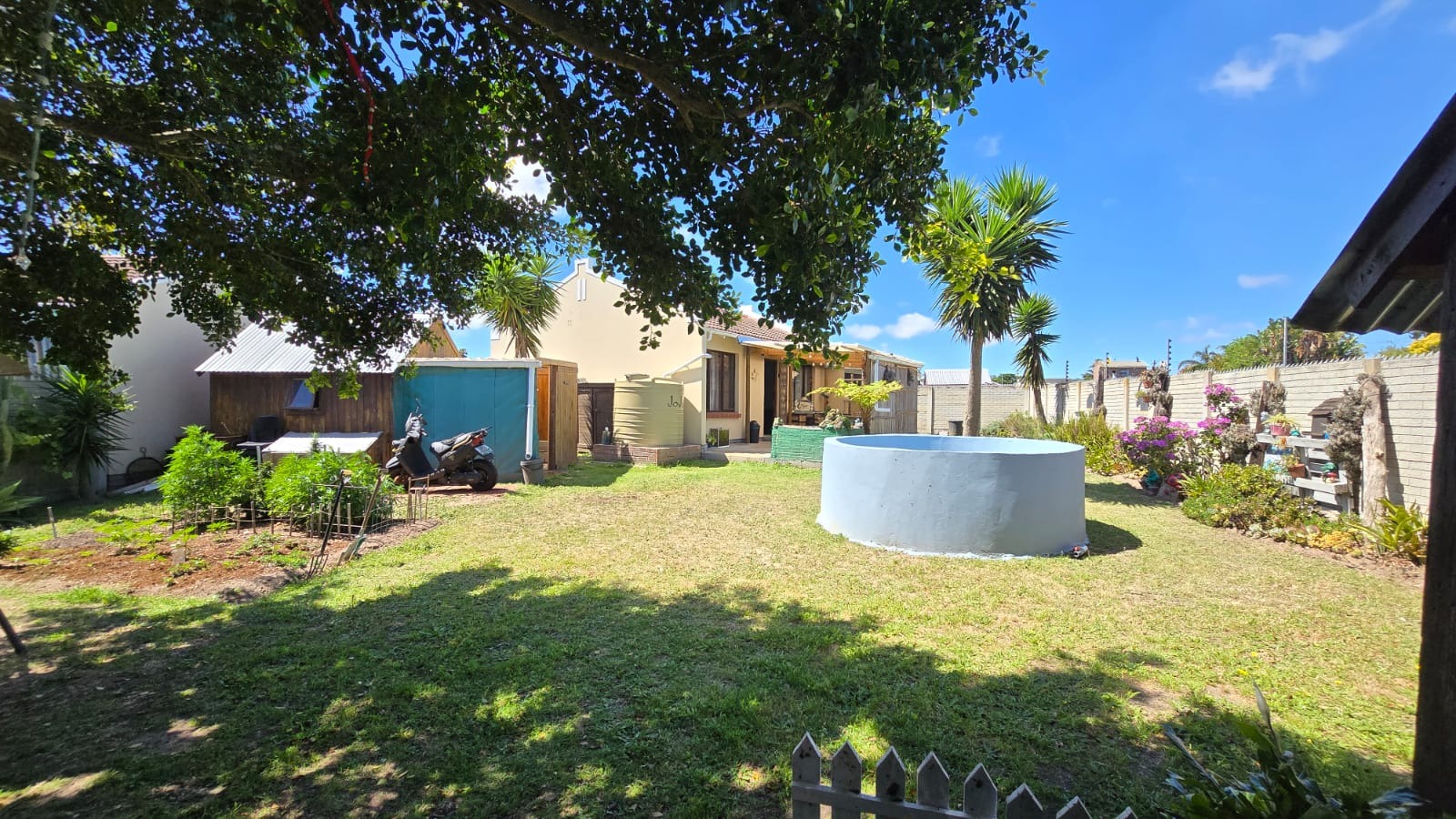 One of the highlights is the enclosed porch—a great spot for morning coffee, a small home office space, or an extra relaxation area. Outside, you’ll find a large private garden, offering rare space in a secure complex. There’s even a small splash pool for hot summer days and two Wendy houses that provide excellent extra storage, a spare room or hobby-room potential.