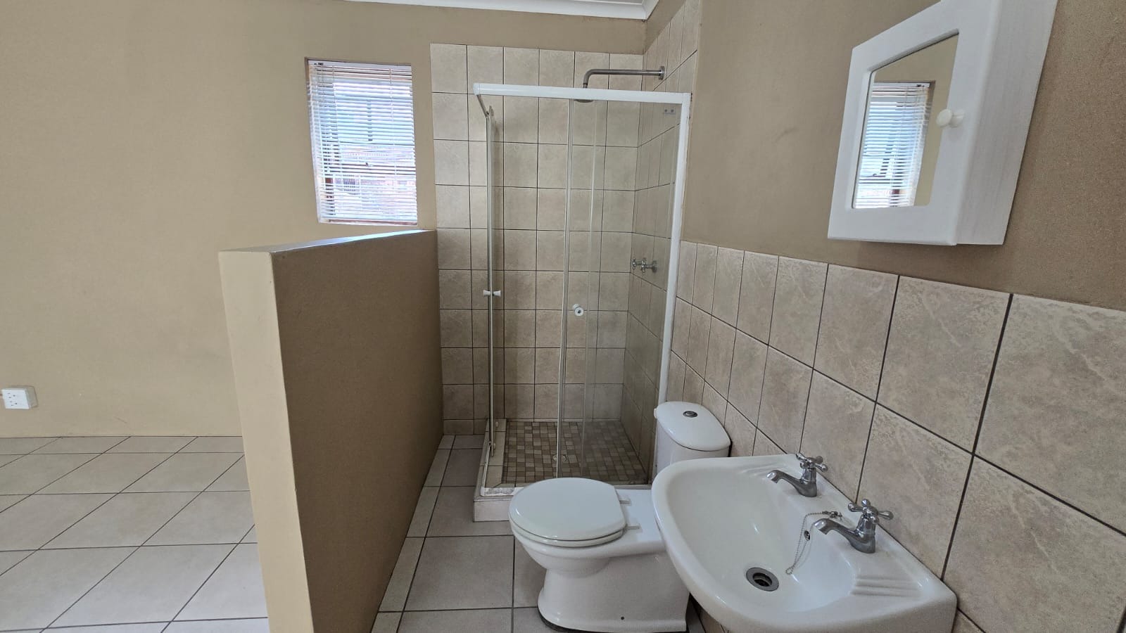 - Bathroom with shower, toilet and basin